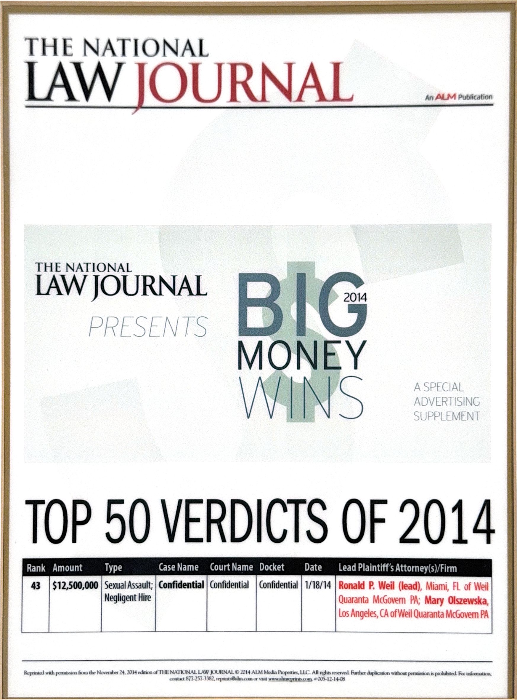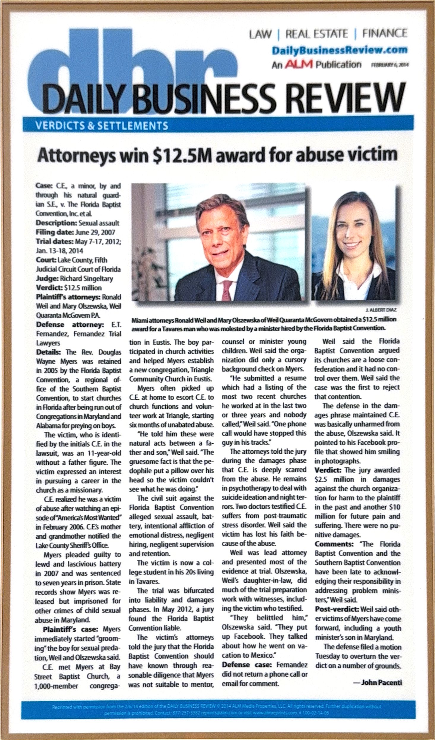 - Miami Attorney Ronald Weil and Mary Olszewska of Weil Quaranta McGobern obtain $12.5 M award for a Tavared man who was murdered by a minister hired by the Florida Baptist Convention.
