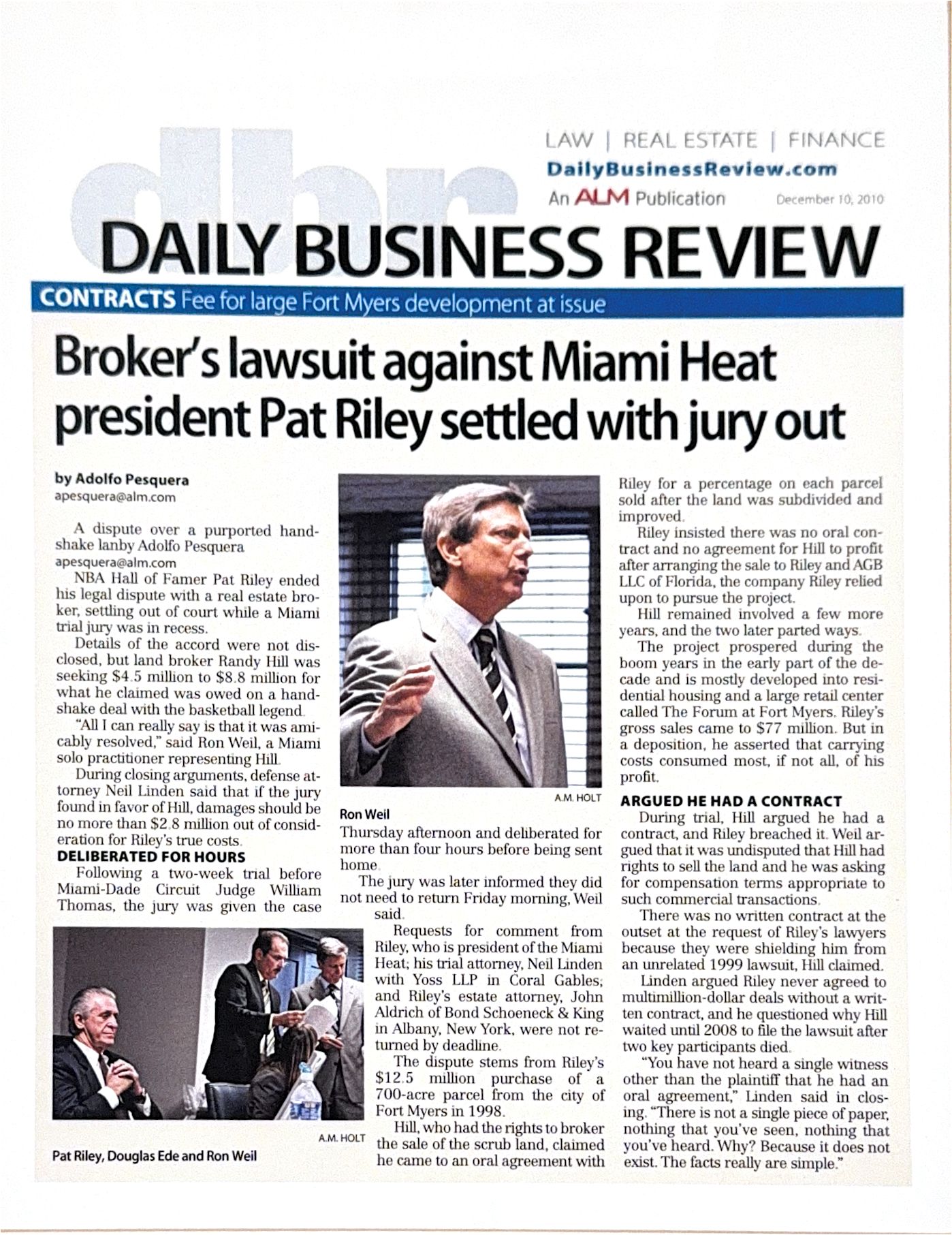 - Commission dispute between Pat Riley and real estate broker Randy Hill.